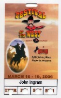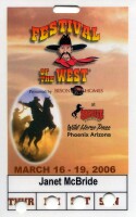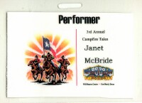 Tags from Campfire Tales and Festival of the WestIn spring and early winter, Janet and John attend two prestigious events: the Campfire Tales gathering of the Texas Cowboys Poet Association in Fort Worth, Texas, and Festival of the West in Chandler, Arizona. Below are calling cards, which were encased in a plastic covering, from those events in past years. Third Annual Campfire Tales in 2000 Festival of the West Badge in 2006 - Janet Festival of the West Badge in 2006 - John -o- |
