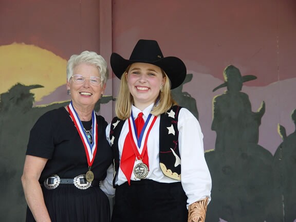 Pictured Above: Janet McBride “The Yodel Queen” who taught LeAnn Rimes to yodel and the “2005 Patsy Montana National Yodeling Champion” – Chelsea Beck of Laverne, OK. For Immediate Release CONTACT: Not yet in her teens, Chelsea Beck, 12 years old, of Laverne, OK captured the title of "2005 Patsy Montana National Yodeling Champion," on Saturday, June 4, in Pineville, Missouri. Chelsea is the daughter of Steve and Shiloh Beck who were in attendance when the coveted gold medal was presented to their daughter. The Beck's ten year old son, Schuyler, also attended the weekend festivities. The new National Yodeling Champion began singing when quite young, but yodeling and playing guitar are relatively new to the blue eyed cowgirl. "I have been yodeling just since last year and playing guitar about eight or nine months." Although it has taken a great deal of hard work and focus to accomplish such quick success, Chelsea Beck also points to the abundance of help and encouragement she has received from professionals. "I owe Janet McBride, The Yodel Queen, so much. I could not have done all of this without her help." It was only a year ago that the champion first attended the Janet McBride Yodel Camp and the Patsy Montana National Yodeling Championship. This was her introduction to yodeling and guitar-playing cowgirls. "I saw all those girls playing their guitars and singing and yodeling and decided I wanted to do that," she said. Chelsea was also quick to point out why Patsy Montana was so important to females in country and western music. "Patsy Montana," she noted, "was the first female country/western artist to sell one million records with the song she wrote, 'I Want To Be A Cowboy's Sweetheart.' It is the only song performed in the National Championship." According to Jane and Larry Frost, festival directors, Chelsea Beck is already a polished songwriter. "It is quite unusual," said the Frosts, "to have someone so young, sensitive and with the skills necessary, to write with the depth that Chelsea exhibits. Her self penned "Cowboy Roy," is a tribute to not only her grandfather, Leroy Hibbs of Beaver, Oklahoma, but also to the American Cowboy." "It is also personal to me," said Larry Frost. "My first name is Roy and I, too, am a grandfather...and my father, Roy Frost, is also a grandfather. It is a good song and very well written. Of course it doesn't hurt," he added, "to have a talented cowgirl perform the song." In addition to the national title, Chelsea also graduated from the Janet McBride Yodel Camp with the designation, Master Yodeler. "She's been a good student." McBride said, "and a fast learner." Chelsea is also becoming a mentor to beginners. During the festive weekend, her brother, Schuyler, worked with fiddle instructor Jake Simpson from Wyandotte, OK. During an opening in the schedule, Chelsea provided her sibling an opportunity to play fiddle on stage with Fiddlin’ Jake. The Patsy Montana National Yodeling Championship and Janet McBride Yodel Camp are held each year, the first weekend in June, at Pineville, Missouri. For additional information, contact festival coordinators at rfrost@olemac.net. Check out Chelsea's website at: www.chelseabeck.com. You can find her debut CD there that will be played over 130 radio stations throughout the U.S and Canada. Chelsea is also one of the top 5 nominees for “Yodeler of the Year” and “Rising Star” with the Academy of Western Artists. She will find out how she does on July 12th at the Will Rogers Awards Ceremony held in Richardson, TX.