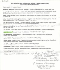 Rex Allen Days - 2003 ProgramRex Allen and his organization have long been close to this webmaster's heart. One of the first country music related TV shows for the year would be theirs, and, if memory serves, LeAnn Rimes made her first nation-wide television appearance on their show. Janet attends "Rex Allen Days" occasionally, and here is her program from 2003. Page One Page Two Page Three -o- |